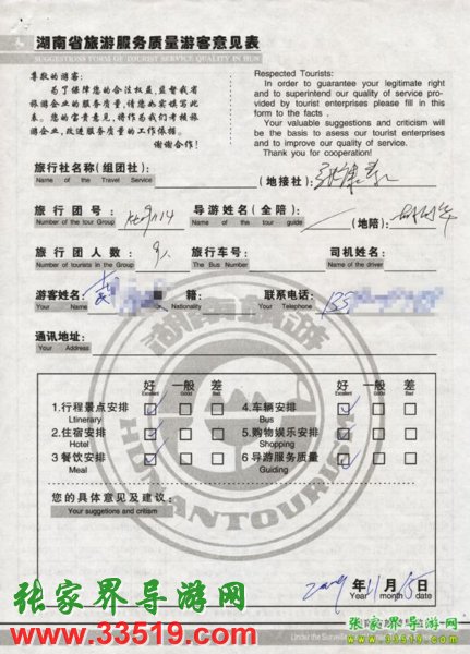 2009年11月14日袁先生一行9人旅游接待質(zhì)量反饋單: